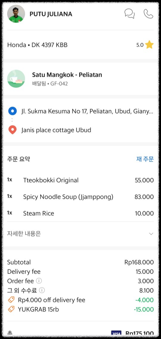 이렇게 발리 여행 중 배달음식 총 3번의 주문을 했었는데 저는 발리에서 맛본 한국 음식 짬뽕 떡볶이가 맛있었어요.